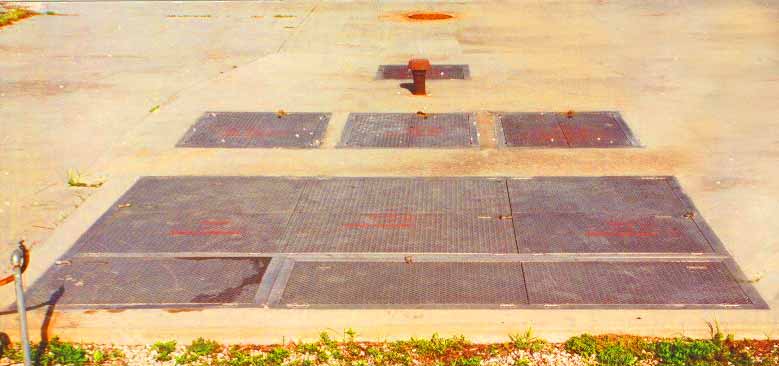 A typical in-field installation, featuring two Series S1R single-doors units for access to the submersible pumps. In the background is an S2R double-door unit for valve vault access.