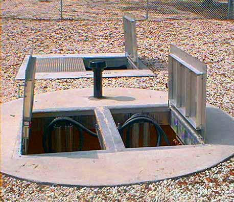 A typical in-field installation, featuring two Series S1R single-doors units for access to the submersible pumps. In the background is an S2R double-door unit for valve vault access.