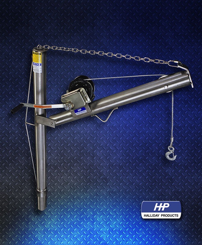 Halliday portable hoists are of all stainless steel construction, and are engineered for basic hoisting requirements of relatively light equipment. They are available in 500, 1000, and 1500 lb. (227, 454, and 680 kg.) load capacities, and with 24" (610mm). fixed or 24" - 36" (610mm - 914mm) adjustable reaches. Capacities will vary based upon height of mast and length of reach. The hoists feature a stainless steel gear/brake winch, with 30 ft. (9 meters) of stainless steel cable, and galvanized safety hook.